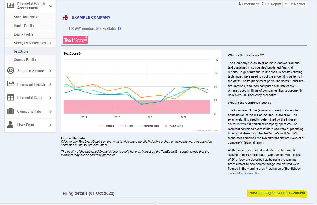 Where a TextScore®️ is available for a Company, you can view the original source document used to generate the score by selecting 'View the original source document' (see circled information on the image below)